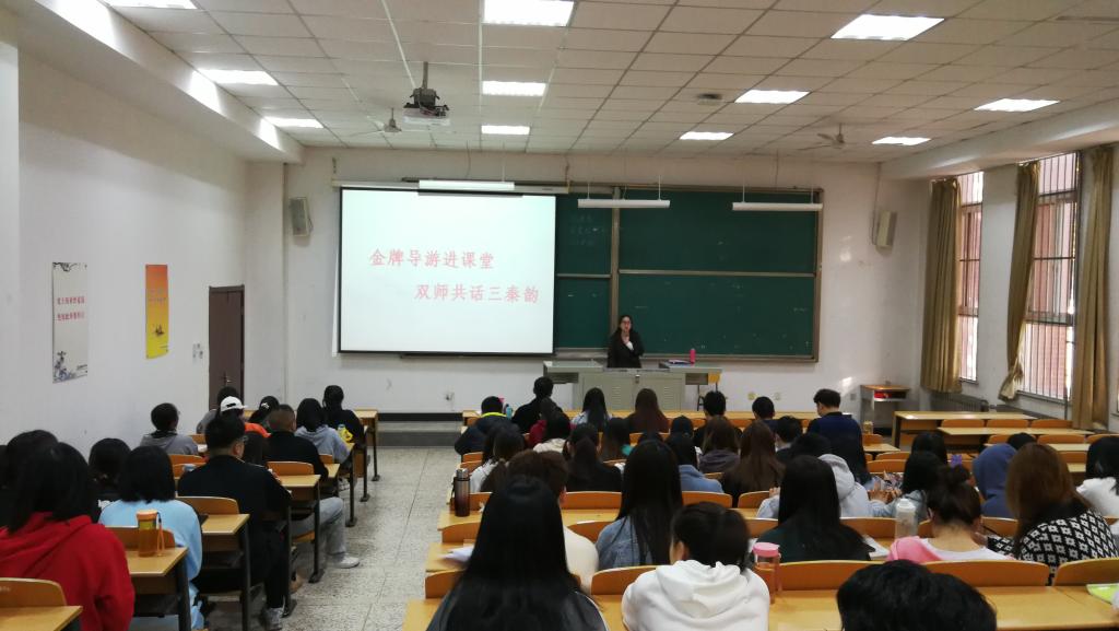 11月6日,旅游与管理分院“史丽宁技能大师工作室”系列活动——“金牌导游进课堂 双师共话三秦韵”活动在北校区举行。国家高级导游、国家旅游局万名旅游英才计划金牌导游、我校外聘教师史丽宁作题为“成功导游的素质与修炼”的报告。旅游与管理分院副院长问建军、旅游管理专业全体师生共180余人聆听了讲座。