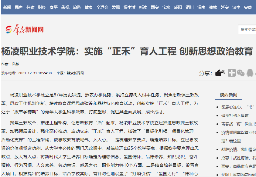 【群众新闻网】杨凌职业技术学院:实施“正禾”育人工程 创新思想政治教育