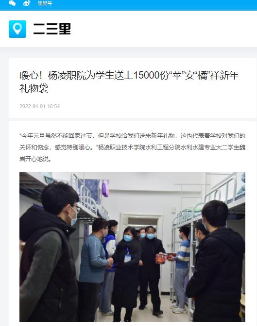 “今年元旦虽然不能回家过节,但是学校给我们送来新年礼物,这也代表着学校对我们的关怀和惦念,感觉特别暖心。”杨凌职业技术学院水利工程分院水利水建专业大二学生魏岩开心地说。