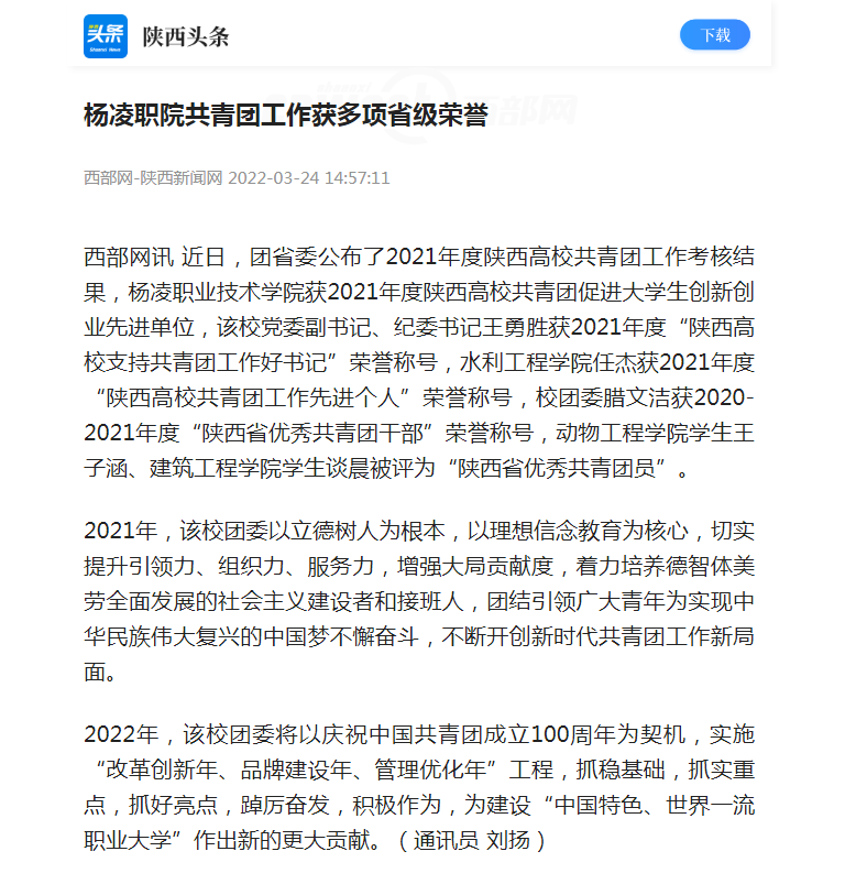 西部网讯 近日,团省委公布了2021年度陕西高校共青团工作考核结果,杨凌职业技术学院获2021年度陕西高校共青团促进大学生创新创业先进单位,该校党委副书记、纪委书记王勇胜获2021年度“陕西高校支持共青团工作好书记”荣誉称号,水利工程学院任杰获2021年度“陕西高校共青团工作先进个人”荣誉称号,校团委腊文洁获2020-2021年度“陕西省优秀共青团干部”荣誉称号,动物工程学院学生王子涵、建筑工程学院学生谈晨被评为“陕西省优秀共青团员”。