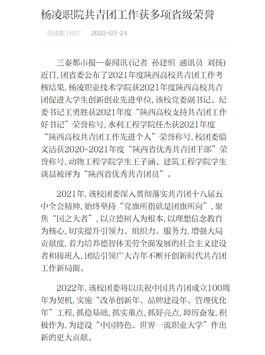 【秦闻】杨凌职院共青团工作获多项省级荣誉
