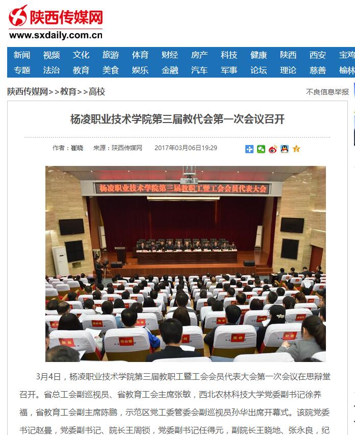 3月4日,杨凌职业技术学院第三届教职工暨工会会员代表大会第一次会议在思辩堂召开。省总工会副巡视员、省教育工会主席张敏,西北农林科技大学党委副书记徐养福,省教育工会副主席陈鹏,示范区党工委管委会副巡视员孙华出席开幕式。该院党委书记赵曼,党委副书记、院长王周锁,党委副书记任得元,副院长王晓地、张永良,纪委书记刘粉莲,副院长张迪出席大会。开幕式由该院党委副书记任得元主持。