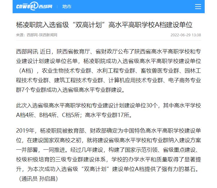 【西部网】杨凌职院入选省级“双高计划”高水平高职学校A档建设单位