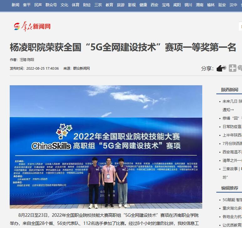 【群众新闻网】杨凌职院荣获全国“5G全网建设技术”赛项一等奖第一名