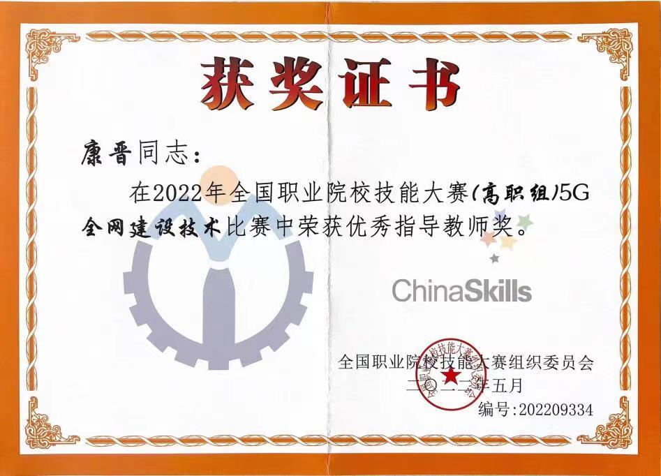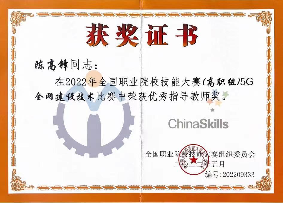 8月22日至23日,2022年全国职业院校技能大赛高职组“5G全网建设技术”赛项在济南职业学院举办,来自全国28个省、56支代表队、112名选手参加了比赛。经过8个小时的激烈比拼,我校信息工程学院学生郑嘉昊、曹文森以总分排名全国第一的成绩,荣获一等奖第一名,取得我校自参赛以来历史最好成绩,指导教师康晋、陈高锋荣获大赛优秀指导教师奖。