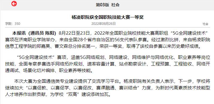 本报讯(通讯员 陈阳)8月22日至23日,2022年全国职业院校技能大赛高职组“5G全网建设技术”赛项在济南职业学院举办,来自全国28个省市自治区的56支代表队参赛。经过激烈比拼,来自杨凌职院信息工程学院的郑嘉昊、曹文森总分排名第一,荣获一等奖,取得了该校自参赛以来历史最好成绩。