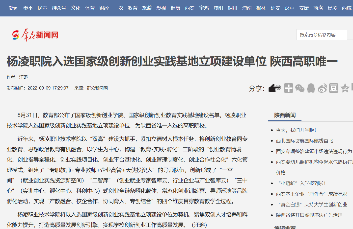 【群众新闻网】杨凌职院入选国家级创新创业实践基地立项建设单位 陕西高职唯一