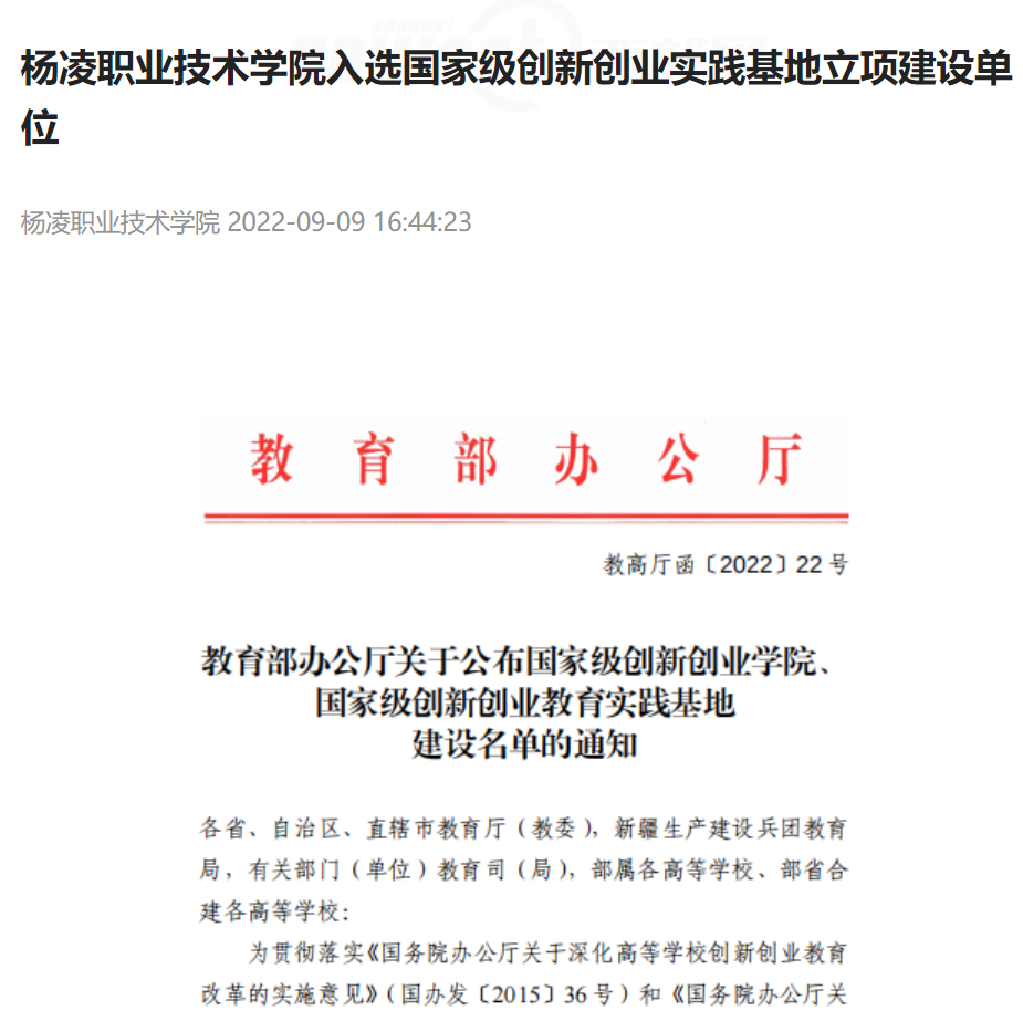 【陕西头条】杨凌职业技术学院入选国家级创新创业实践基地立项建设单位