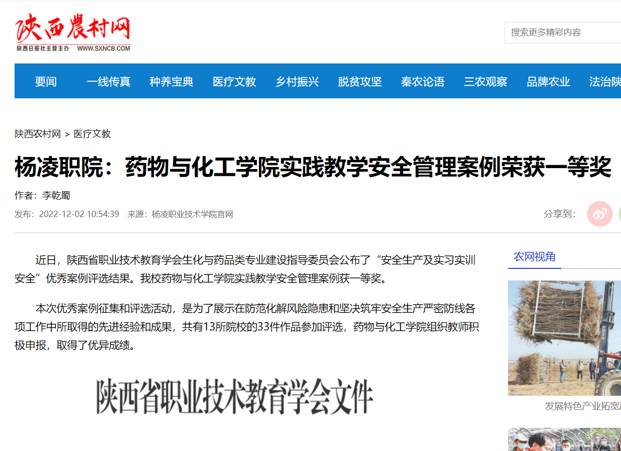 【陕西农村网】杨凌职院:药物与化工学院实践教学安全管理案例荣获一等奖