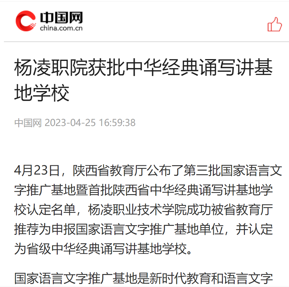 4月23日,陕西省教育厅公布了第三批国家语言文字推广基地暨首批陕西省中华经典诵写讲基地学校认定名单,杨凌职业技术学院成功被省教育厅推荐为申报国家语言文字推广基地单位,并认定为省级中华经典诵写讲基地学校。