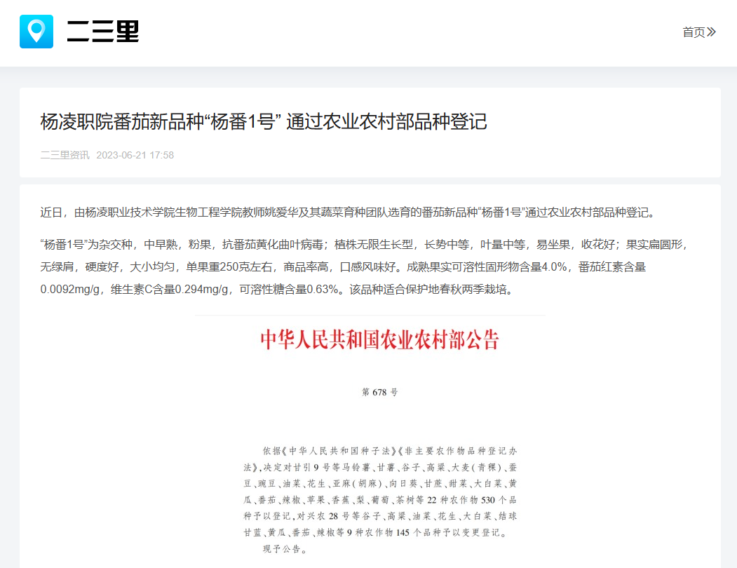 近日,由杨凌职业技术学院生物工程学院教师姚爱华及其蔬菜育种团队选育的番茄新品种“杨番1号”通过农业农村部品种登记。