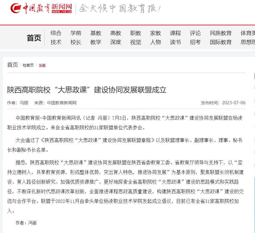 中国教育报-中国教育新闻网讯(记者 冯丽)7月5日,陕西高职院校“大思政课”建设协同发展联盟在杨凌职业技术学院成立。来自全省高职院校的31家联盟单位代表参会。