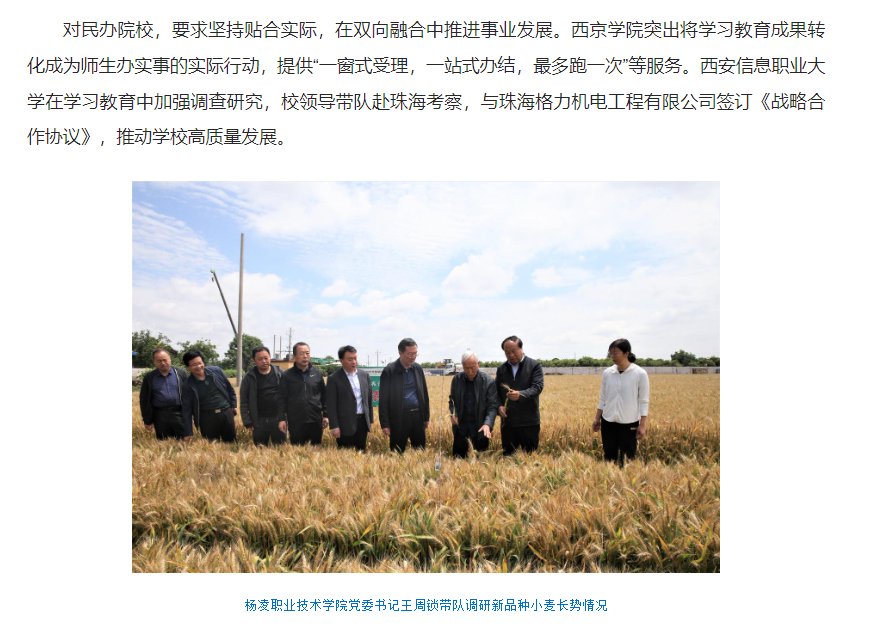 省属高职院校突出专业优势,在把握规律中彰显教育特色。杨凌职业技术学院将主题教育与现代农业发展、助力乡村振兴等工作有机衔接,开展新品种小麦长势实践调研、乡村振兴“五联一抓”工作调研等活动,组建15个工作队包村发展,积极打造新时代职业教育助力乡村振兴示范样板。