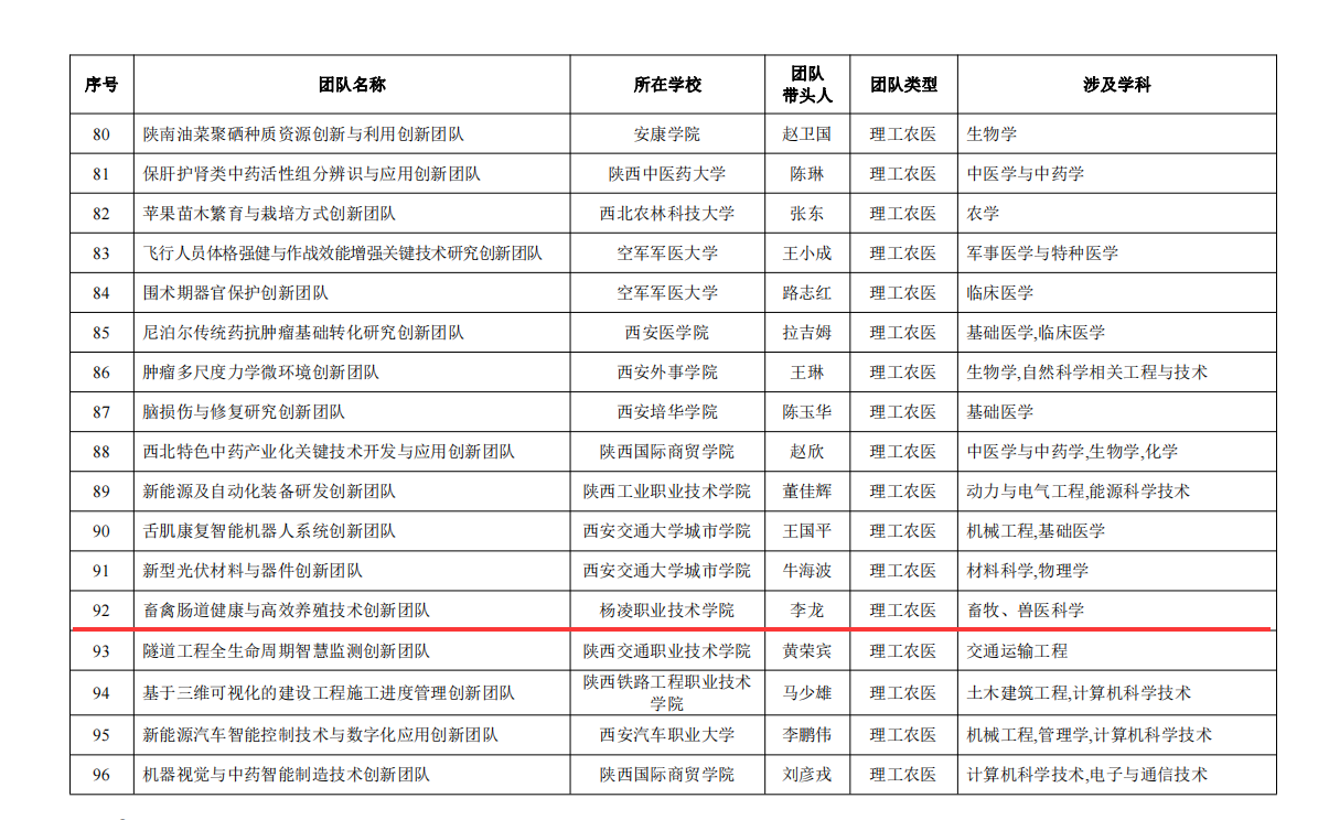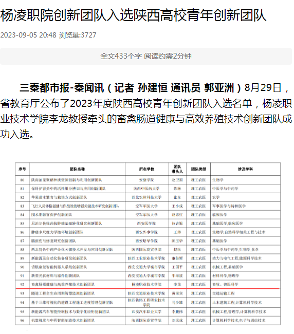 三秦都市报-秦闻讯(记者 孙建恒 通讯员 郭亚洲)8月29日,省教育厅公布了2023年度陕西高校青年创新团队入选名单,杨凌职业技术学院李龙教授牵头的畜禽肠道健康与高效养殖技术创新团队成功入选。