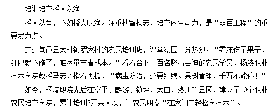 据介绍,陕西各大高校的教育培训,涵盖专题辅导、专家讲座、田间教学等多种形式,目前已培养骨干教师、医生护士、农技人员、乡村干部等6万余人。