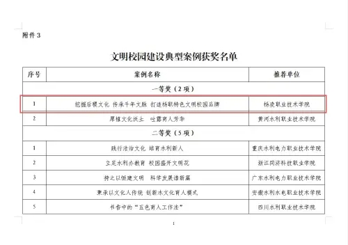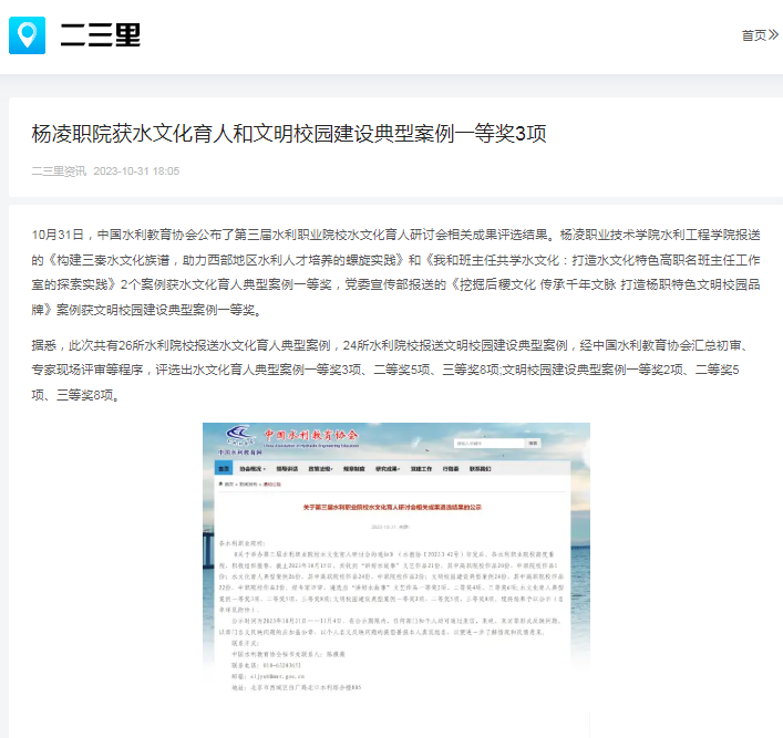 10月31日,中国水利教育协会公布了第三届水利职业院校水文化育人研讨会相关成果评选结果。杨凌职业技术学院水利工程学院报送的《构建三秦水文化族谱,助力西部地区水利人才培养的螺旋实践》和《我和班主任共学水文化:打造水文化特色高职名班主任工作室的探索实践》2个案例获水文化育人典型案例一等奖,党委宣传部报送的《挖掘后稷文化 传承千年文脉 打造杨职特色文明校园品牌》案例获文明校园建设典型案例一等奖。