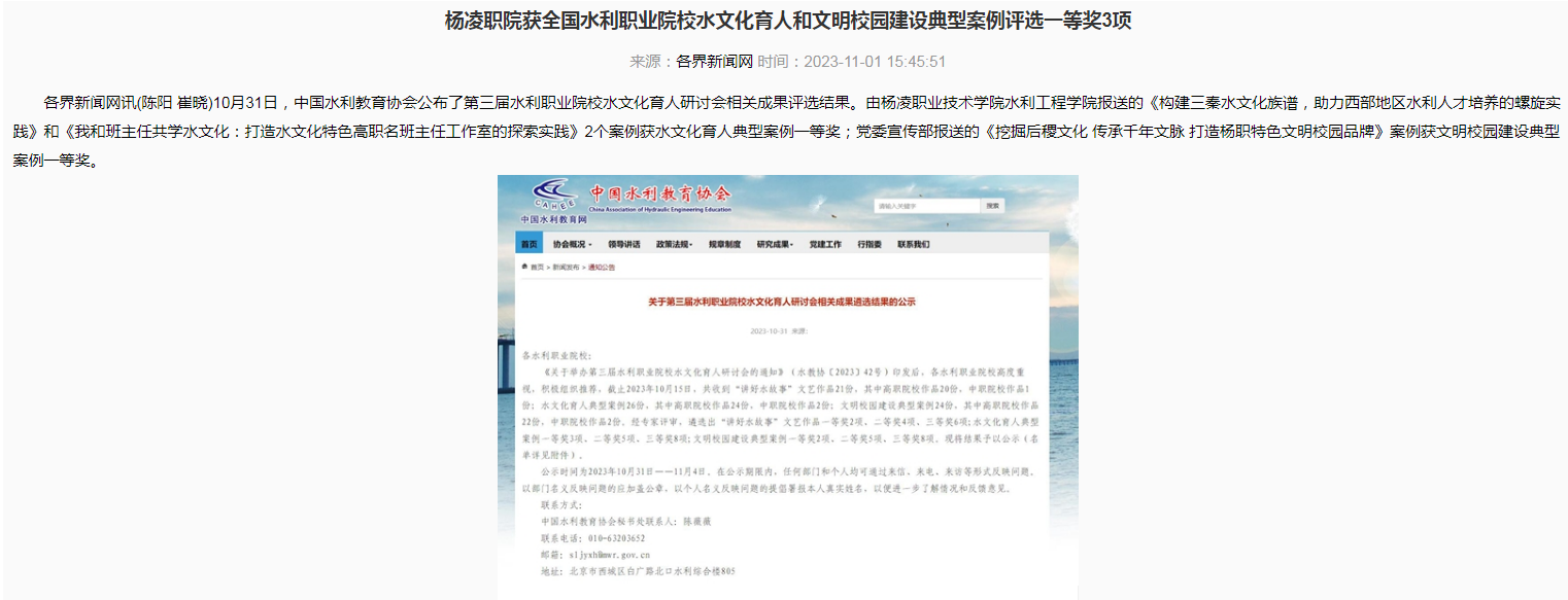 【各界新闻网】杨凌职院获全国水利职业院校水文化育人和文明校园建设典型案例评选一等奖3项
