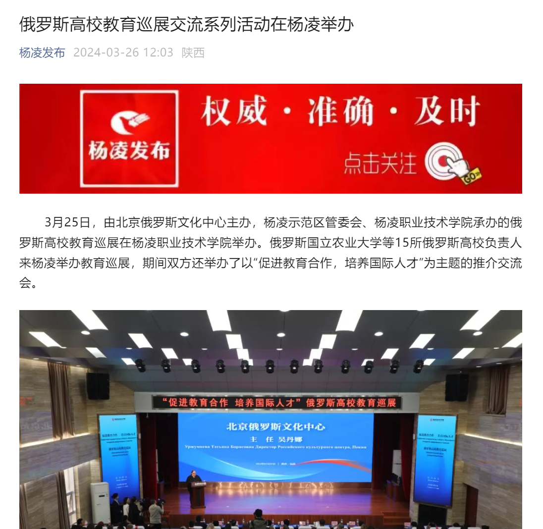 3月25日,由北京俄罗斯文化中心主办,杨凌示范区管委会、杨凌职业技术学院承办的俄罗斯高校教育巡展在杨凌职业技术学院举办。俄罗斯国立农业大学等15所俄罗斯高校负责人来杨凌举办教育巡展,期间双方还举办了以“促进教育合作,培养国际人才”为主题的推介交流会。