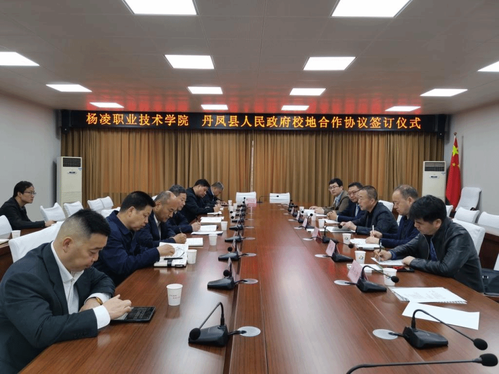 4月30日上午,杨凌职业技术学院与丹凤县人民政府签订校地合作协议。副校长胡俊鹏,丹凤县人民政府副县长龚富杰,丹凤县林业局局长罗浩、商贸局局长张鹏凯等出席签约仪式。