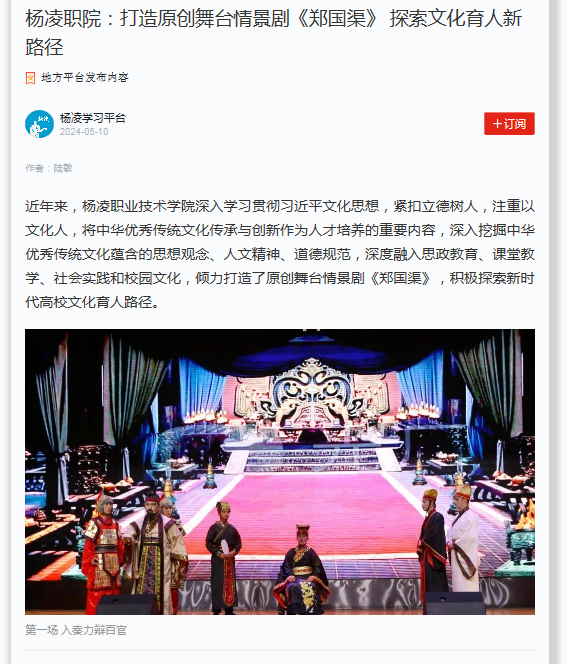 近年来,杨凌职业技术学院深入学习贯彻习近平文化思想,紧扣立德树人,注重以文化人,将中华优秀传统文化传承与创新作为人才培养的重要内容,深入挖掘中华优秀传统文化蕴含的思想观念、人文精神、道德规范,深度融入思政教育、课堂教学、社会实践和校园文化,倾力打造了原创舞台情景剧《郑国渠》,积极探索新时代高校文化育人路径。