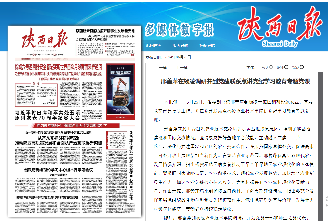随后,邢善萍到杨凌职业技术学院调研,并为党员干部和师生党员代表讲党纪学习教育专题党课。邢善萍强调,要深入学习贯彻习近平总书记关于全面加强党的纪律建设的重要论述,准确把握六项纪律的主旨要义和规定要求,增强严守纪律的政治自觉、思想自觉、行动自觉。要把开展党纪学习教育与推动职业教育高质量发展齐抓共促一体推进,坚持立德树人,深耕内涵发展,为谱写陕西新篇、争做西部示范作出更大贡献。