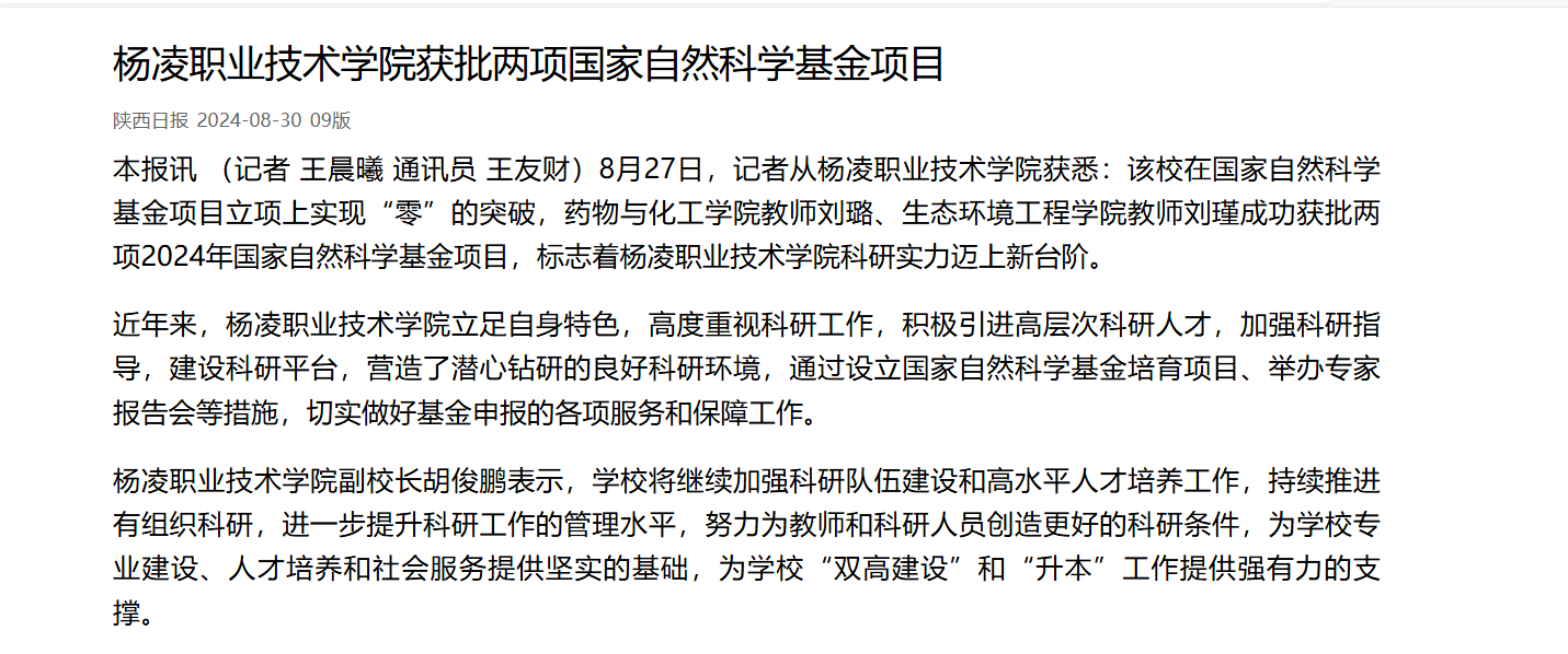 8月27日,记者从杨凌职业技术学院获悉:该校在国家自然科学基金项目立项上实现“零”的突破,药物与化工学院教师刘璐、生态环境工程学院教师刘瑾成功获批两项2024年国家自然科学基金项目,标志着杨凌职业技术学院科研实力迈上新台阶。