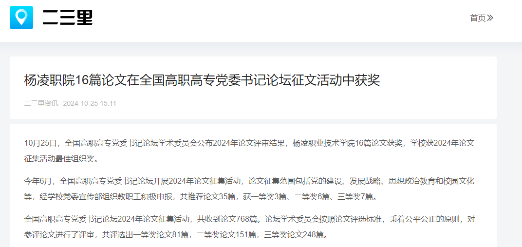 1025日,全国高职高专党委书记论坛学术委员会公布2024年论文评审结果,杨凌职业技术学院16篇论文获奖,学校获2024年论文征集活动最佳组织奖。