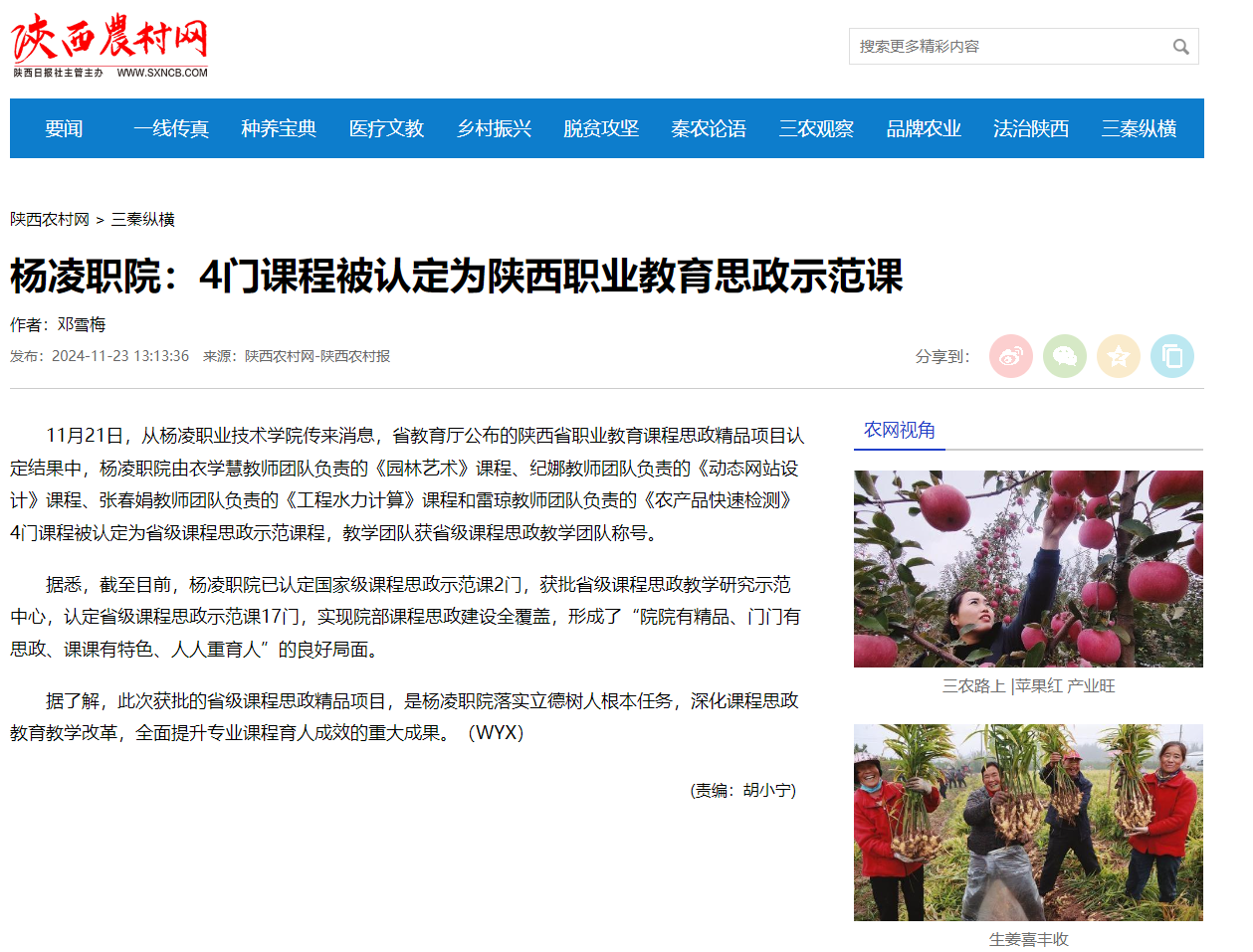 据悉,截至目前,杨凌职院已认定国家级课程思政示范课2门,获批省级课程思政教学研究示范中心,认定省级课程思政示范课17门,实现院部课程思政建设全覆盖,形成了“院院有精品、门门有思政、课课有特色、人人重育人”的良好局面。