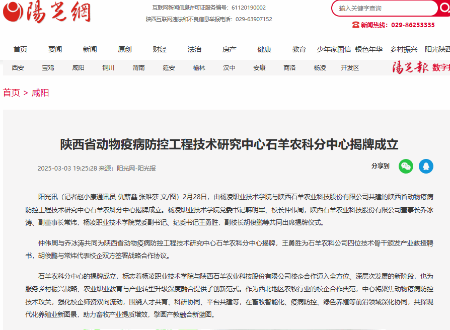 阳光讯(记者赵小康通讯员 仇薪鑫 张唯莎 文/图)2月28日,由杨凌职业技术学院与陕西石羊农业科技股份有限公司共建的陕西省动物疫病防控工程技术研究中心石羊农科分中心揭牌成立。杨凌职业技术学院党委书记韩明军、校长仲伟周,陕西石羊农业科技股份有限公司董事长乔冰涛、副董事长常炜,杨凌职业技术学院党委副书记、纪委书记王勇胜,副校长胡俊鹏等共同出席揭牌仪式。