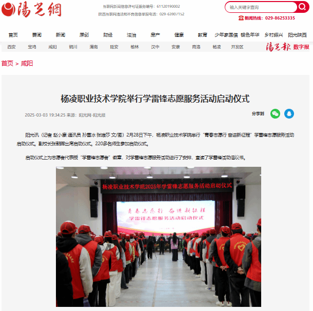阳光讯(记者 赵小康 通讯员 孙雪冰 张唯莎 文/图)2月28日下午,杨凌职业技术学院举行“青春志愿行 奋进新征程”学雷锋志愿服务活动启动仪式。副校长张朝晖出席启动仪式。220多名师生参加启动仪式。
