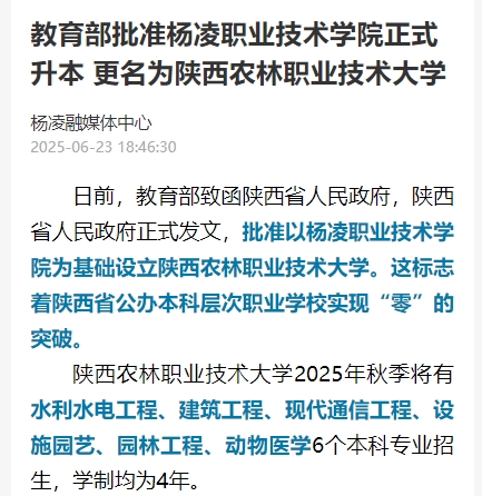 【爱杨凌】教育部批准杨凌职业技术学院正式升本 更名为陕西农林职业技术大学