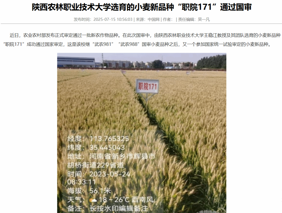 【中国网】陕西农林职业技术大学选育的小麦新品种“职院171”通过国审