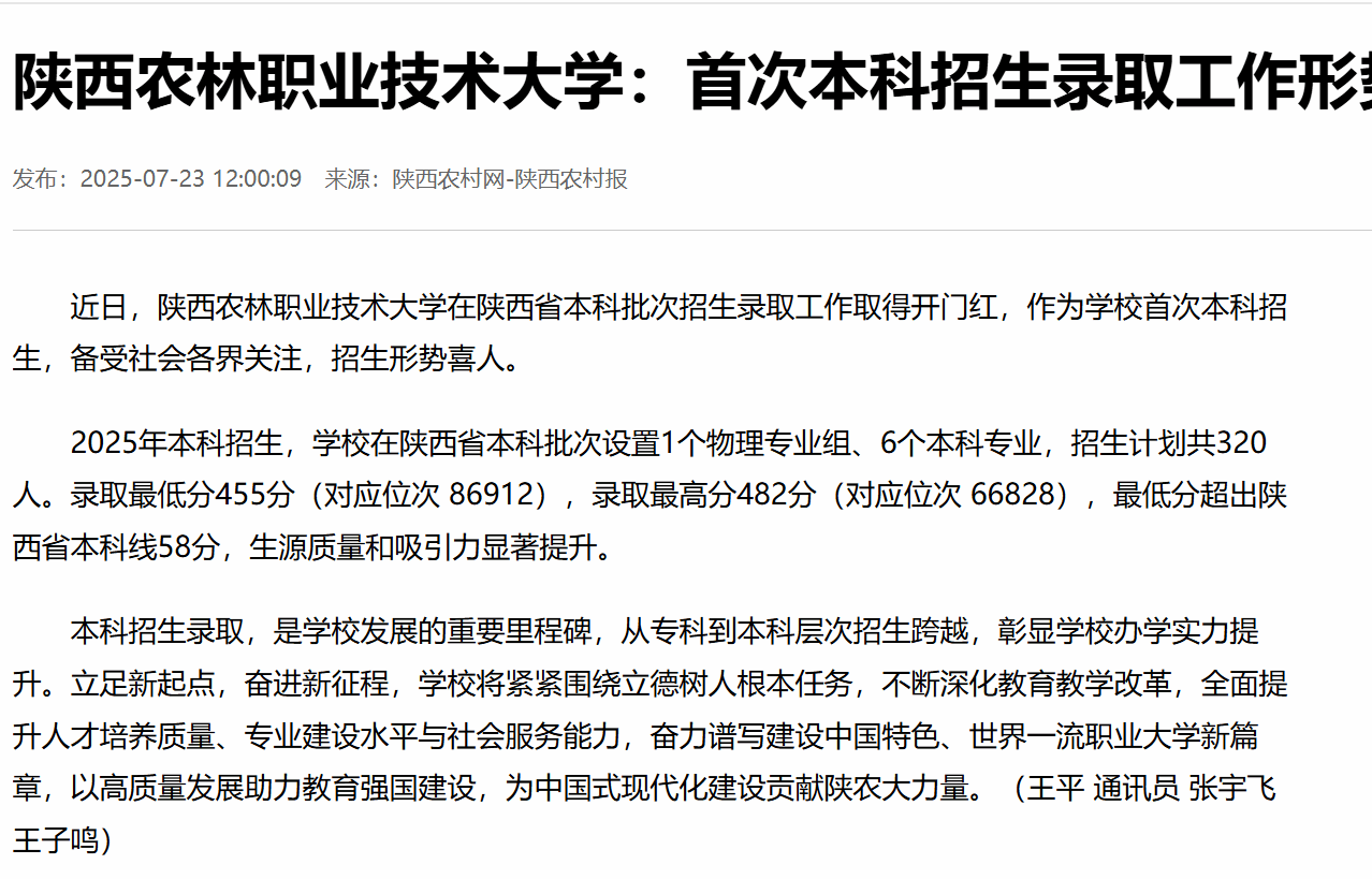 近日,陕西农林职业技术大学在陕西省本科批次招生录取工作取得开门红,作为学校首次本科招生,备受社会各界关注,招生形势喜人。