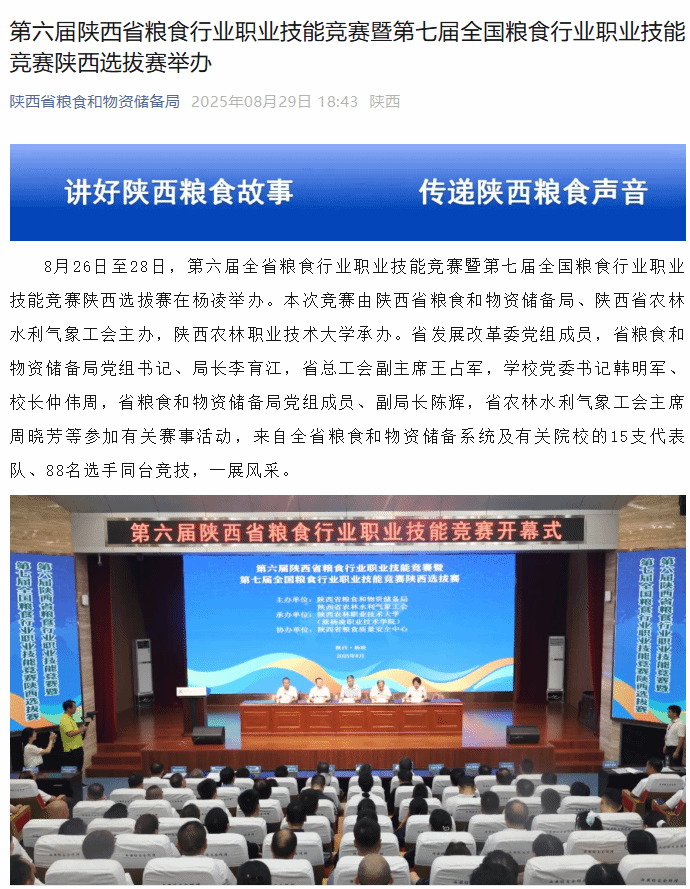 826日至28日,第六届全省粮食行业职业技能竞赛暨第七届全国粮食行业职业技能竞赛陕西选拔赛在杨凌举办。本次竞赛由陕西省粮食和物资储备局、陕西省农林水利气象工会主办,陕西农林职业技术大学承办。省发展改革委党组成员,省粮食和物资储备局党组书记、局长李育江,省总工会副主席王占军,学校党委书记韩明军、校长仲伟周,省粮食和物资储备局党组成员、副局长陈辉,省农林水利气象工会主席周晓芳等参加有关赛事活动,来自全省粮食和物资储备系统及有关院校的15支代表队、88名选手同台竞技,一展风采。