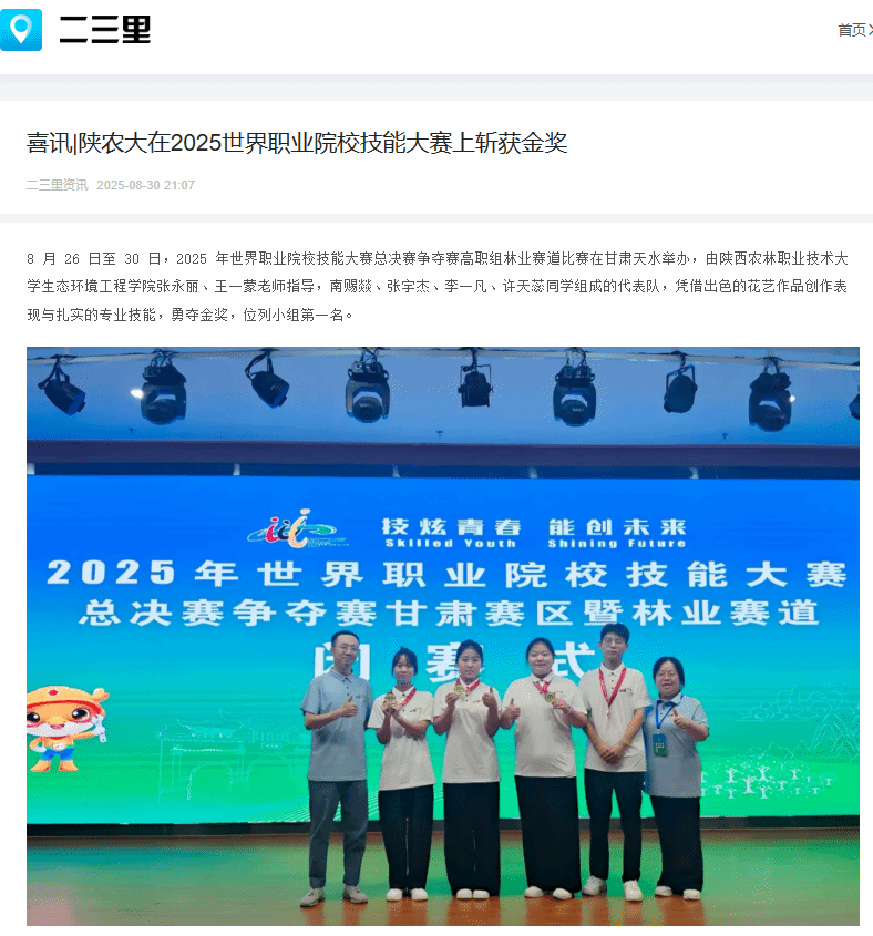 8 月 26 日至 30 日,2025 年世界职业院校技能大赛总决赛争夺赛高职组林业赛道比赛在甘肃天水举办,由陕西农林职业技术大学生态环境工程学院张永丽、王一蒙老师指导,南赐燚、张宇杰、李一凡、许天蕊同学组成的代表队,凭借出色的花艺作品创作表现与扎实的专业技能,勇夺金奖,位列小组第一名。