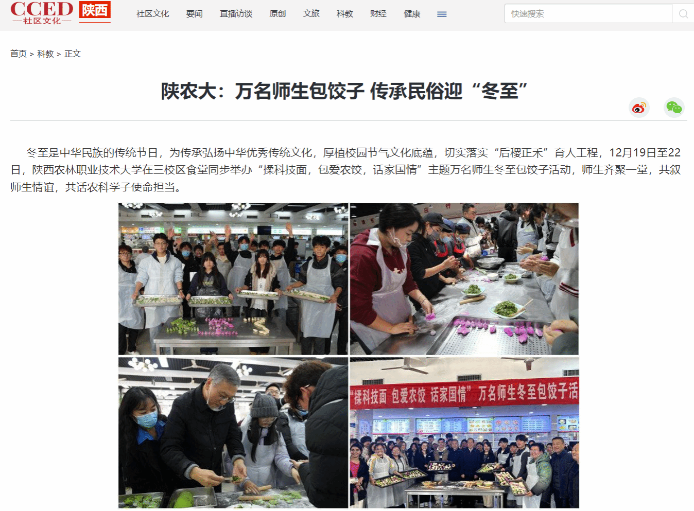 冬至是中华民族的传统节日,为传承弘扬中华优秀传统文化,厚植校园节气文化底蕴,切实落实后稷正禾育人工程,1219日至22日,陕西农林职业技术大学在三校区食堂同步举办揉科技面,包爱农饺,话家国情主题万名师生冬至包饺子活动,师生齐聚一堂,共叙师生情谊,共话农科学子使命担当。