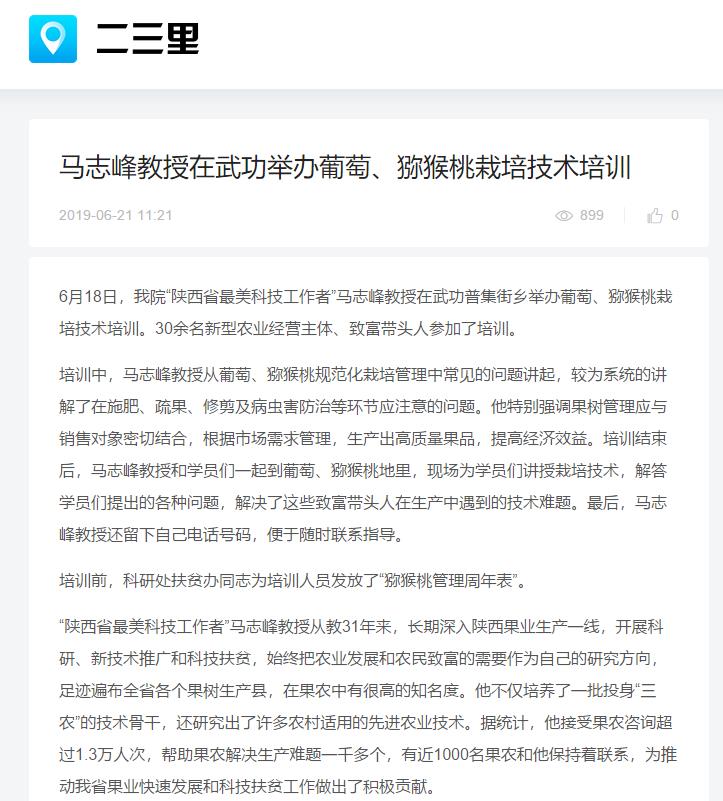 “陕西省最美科技工作者”马志峰教授从教31年来,长期深入陕西果业生产一线,开展科研、新技术推广和科技扶贫,始终把农业发展和农民致富的需要作为自己的研究方向,足迹遍布全省各个果树生产县,在果农中有很高的知名度。他不仅培养了一批投身“三农”的技术骨干,还研究出了许多农村适用的先进农业技术。据统计,他接受果农咨询超过1.3万人次,帮助果农解决生产难题一千多个,有近1000名果农和他保持着联系,为推动我省果业快速发展和科技扶贫工作做出了积极贡献。