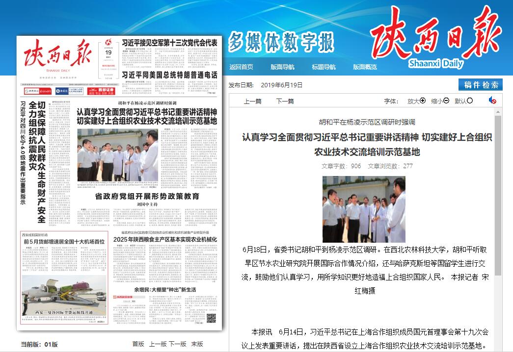 胡和平在调研中要求,我们要把习近平总书记的关心关怀转化为强大精神动力,充分发挥杨凌示范区省部共建体制优势,主动融入“一带一路”建设,在更大范围深化同上合组织国家农业交流合作。杨凌示范区要坚持区校融合发展,完善产学研深度融合的技术创新体系,做好成果转化、示范推广等工作,高质量建好上合组织农业技术交流培训示范基地。