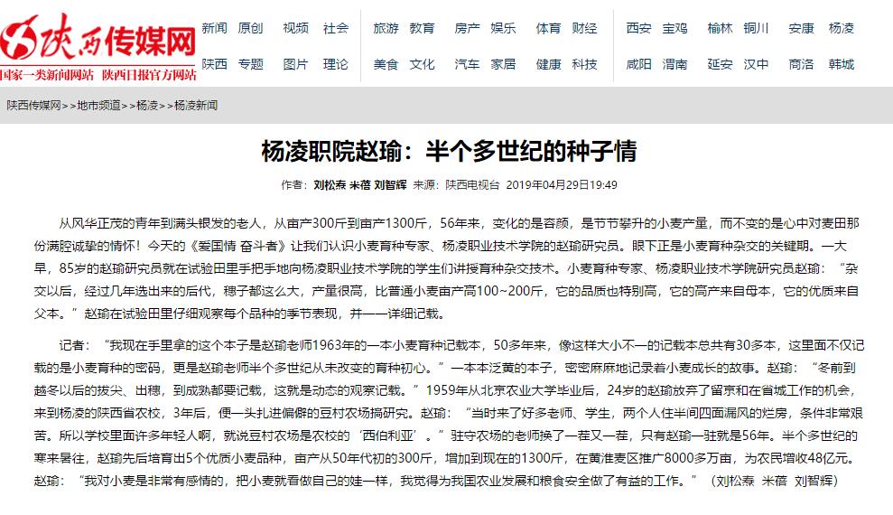 从风华正茂的青年到满头银发的老人,从亩产300斤到亩产1300斤,56年来,变化的是容颜,是节节攀升的小麦产量,而不变的是心中对麦田那份满腔诚挚的情怀!今天的《爱国情 奋斗者》让我们认识小麦育种专家、杨凌职业技术学院的赵瑜研究员。眼下正是小麦育种杂交的关键期。一大早,85岁的赵瑜研究员就在试验田里手把手地向杨凌职业技术学院的学生们讲授育种杂交技术。小麦育种专家、杨凌职业技术学院研究员赵瑜:“杂交以后,经过几年选出来的后代,穗子都这么大,产量很高,比普通小麦亩产高100~200斤,它的品质也特别高,它的高产来自母本,它的优质来自父本。”赵瑜在试验田里仔细观察每个品种的季节表现,并一一详细记载。