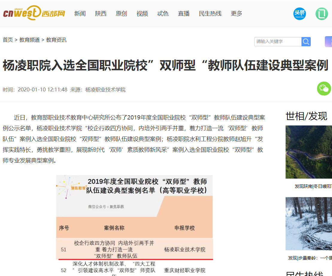 近日,教育部职业技术教育中心研究所公布了2019年度全国职业院校“双师型”教师队伍建设典型案例公示名单,杨凌职业技术学院“校企行政四方协同,内培外引两手并重,着力打造一流‘双师型’教师队伍”案例入选全国职业院校“双师型”教师队伍建设典型案例;杨凌职院水利工程分院教师赵旭升“发挥实践特长,勇挑教学重担,展现新时代‘双师’素质教师新风采”案例入选全国职业院校“双师型”教师专业发展典型案例。
