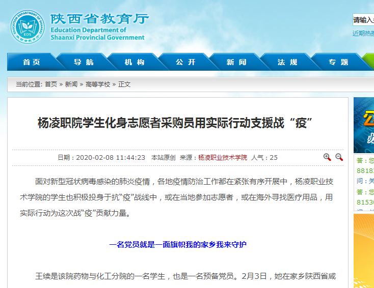 面对新型冠状病毒感染的肺炎疫情,各地疫情防治工作都在紧张有序开展中,杨凌职业技术学院的学生也积极投身于抗“疫”战线中,或在当地参加志愿者,或在海外寻找医疗用品,用实际行动为这次战“疫”贡献力量。