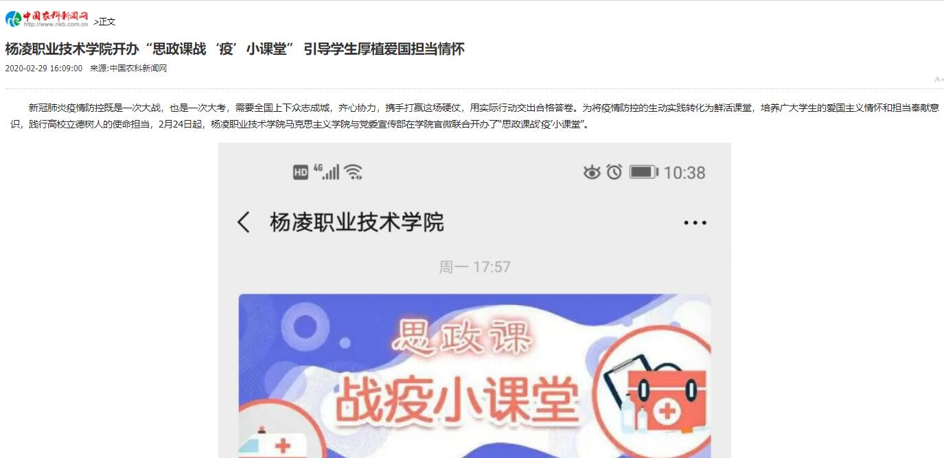 疫情防控是一场没有硝烟的战争,更是一场生动的“思政大课”。为了上好这堂课,学院马克思主义学院的教师们及时搜集整理疫情防控相关素材,围绕爱国主义、敬畏生命、社会责任、遵守规则、爱与感恩等,不断加强疫情防控期间的思想政治教育;党委宣传部深入挖掘在疫情防控一线的先进师生和典型事迹,并借助校园网站、学院官微和中省主流媒体做好宣传,不断凝聚和传播正能量,激励广大师生勇担时代重任,在各自岗位上为疫情防控作出应有贡献。(杨凌职业技术学院党委宣传部农业科技报全媒体记者 唐艳丽)