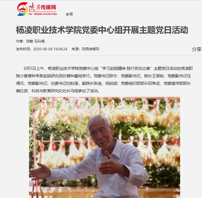 65日上午,杨凌职业技术学院党委中心组“学习赵瑜精神 践行劳动之美”主题党日活动在杨凌职院小麦育种专家赵瑜研究员的育种基地举行。党委书记陈宁,党委副书记、院长王周锁,党委副书记任得元,党委副书记、纪委书记刘粉莲,副院长张迪、祝战斌;党委组织部部长田争运,党委宣传部部长裴红波,科技与教育研究处处长冯旭参加了活动。