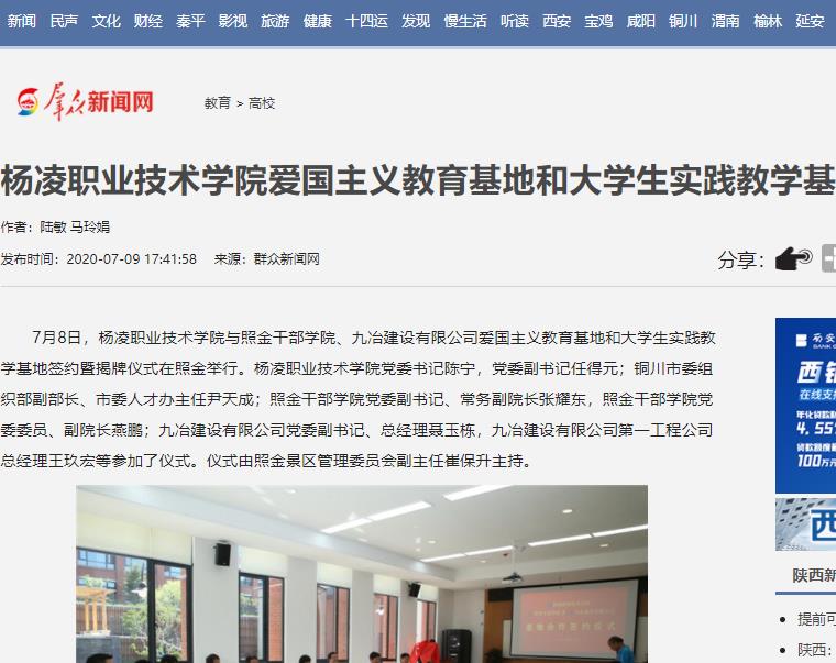 7月8日,杨凌职业技术学院与照金干部学院、九冶建设有限公司爱国主义教育基地和大学生实践教学基地签约暨揭牌仪式在照金举行。杨凌职业技术学院党委书记陈宁,党委副书记任得元;铜川市委组织部副部长、市委人才办主任尹天成;照金干部学院党委副书记、常务副院长张耀东,照金干部学院党委委员、副院长燕鹏;九冶建设有限公司党委副书记、总经理聂玉栋,九冶建设有限公司第一工程公司总经理王玖宏等参加了仪式。仪式由照金景区管理委员会副主任崔保升主持。