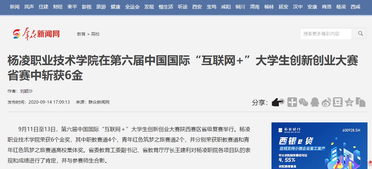 9月11日至13日,第六届中国国际“互联网+”大学生创新创业大赛陕西赛区省级复赛举行。杨凌职业技术学院荣获6个金奖,其中职教赛道4个,青年红色筑梦之旅赛道2个,并分别荣获职教赛道和青年红色筑梦之旅赛道高校集体奖。省委教育工委副书记、省教育厅厅长王建利对杨凌职院各项目队的表现和成绩进行了肯定,并与参赛师生合影。