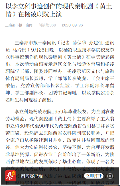 【三秦都市报】以李立科事迹创作的现代秦腔剧《黄土情》在杨凌职院上演