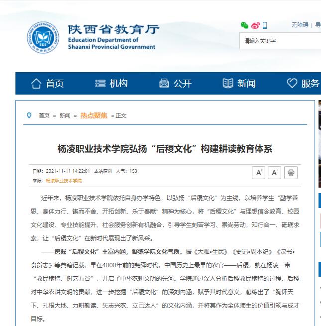 【陕西省教育厅】热点聚焦:杨凌职业技术学院弘扬“后稷文化”构建耕读教育体系