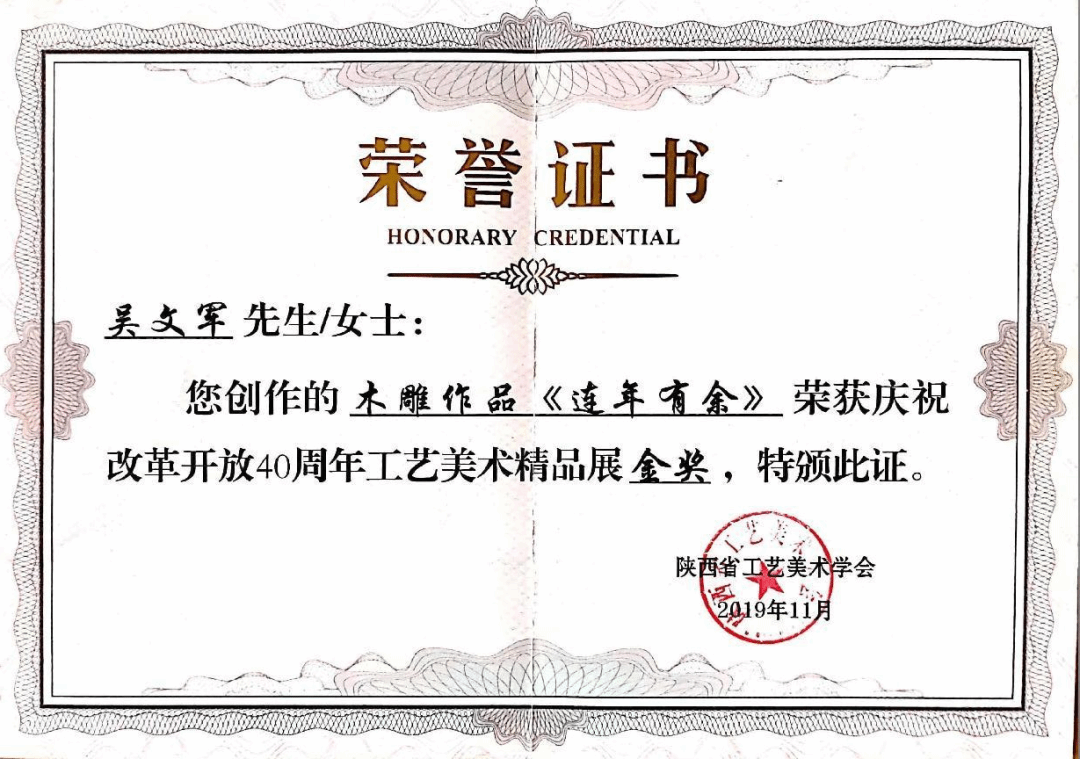 2022年,被认定为杨凌区非物质文化遗产项目代表性传承人。2023年,成功申报陕西省技能大师工作室,获评陕西省技术能手;取得一级木雕工技能等级证书和工艺品雕刻工二级职业技能等级证书。2024年,作品《花好月圆》荣获陕西省工艺美术精品展金奖